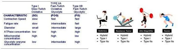 Sería un trabajo semejante a diferenciar modalidades de ciclismo de potencia como pueden ser el trabajo de pista o CXO (mountain bike en circuito cerrado) donde podemos ver a ciclistas tremendamente fuertes y con gran masa muscular con predominancia de fibras rápidas; de las modalidades de ciclismo en ruta donde predominan ciclistas con mucha menos masa muscular y en los que predominan las fibras lentas, siempre con la excepciones de los sprinter los cuales son capaces de trabajar durante 150-180km con cadencias más altas e involucración de fibras lentas para llegar al último km donde impartirán su ley y su fuerza para realizar unos sprints agónicos con una gran demanda de fibras rápidas.
