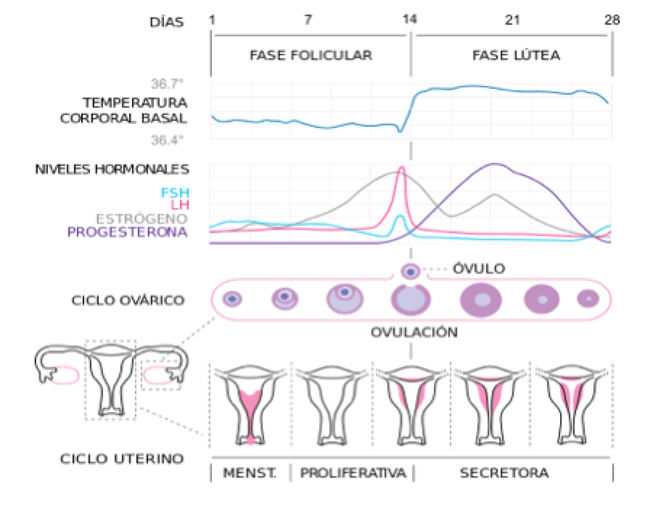 Tabla: Esquema de las fases del ciclo menstrual, la producción de hormonas y la temperatura corporal basal