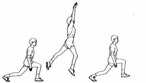 Ejercicio 3: zancada y salto vertical, elevando los brazos en el momento del salto. La caída debe ser en posición de “Split”, tal y como al inicio del movimiento. Caemos en posición completamente vertical y tras impactar repetimos el salto de forma inmediata.
