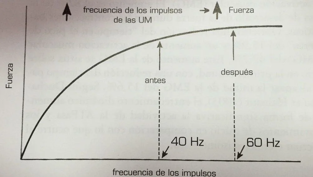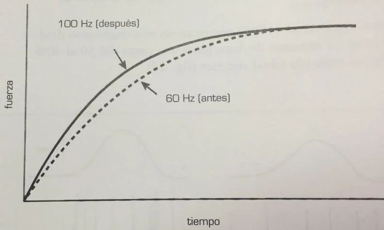 El aumento de la frecuencia de impulsos tiene una acción directa sobre la producción de fuerza, alcanzando en un menor periodo de tiempo la fuerza máxima del sujeto.