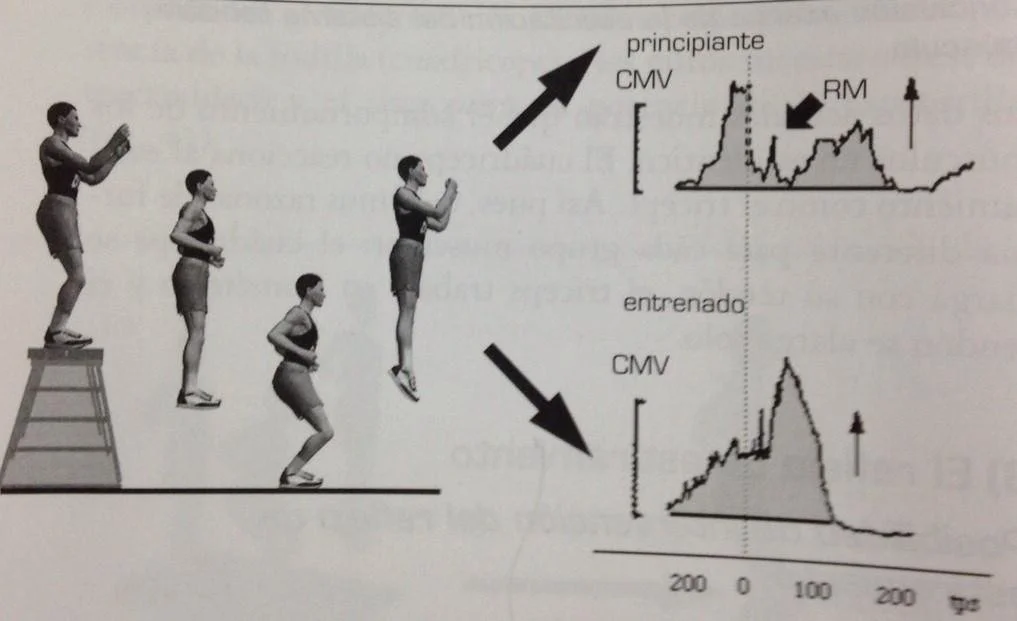 La línea vertical refleja el desarrollo temporal; la abscisa representa la actividad eléctrica del tríceps sural. Hay una clara diferencia entre ambos deportistas, el principiante desarrolla una fuerza mayor a la CMV (actividad eléctrica durante una contracción voluntaria máxima) mientras está en el aire, apareciendo el reflejo de estiramiento con una actividad eléctrica baja, por lo que no se sumará a la acción voluntaria del sujeto. El deportista entrenado prepara su musculatura antes de contactar con el suelo (60% CMV aproximadamente), con el fin de desarrollar el mayor momento de fuerza durante el contacto, añadiendo la acción del reflejo miotático a la acción de salto del deportista.