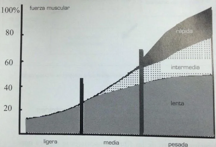 Sea cual sea el tipo de movimiento, las primeras fibras en reclutarse son las lentas y después las rápidas (Ley de Henneman, según Verkhoshasnsky. Y. (7)); se trata de un paso obligado del impulso por las fibras lentas antes que por las rápidas, lo cual no es favorable para los movimientos explosivos. A mayores cargas, observamos un mayor reclutamiento de fibras rápidas y viceversa. Observamos dicho comportamiento en la siguiente tabla: