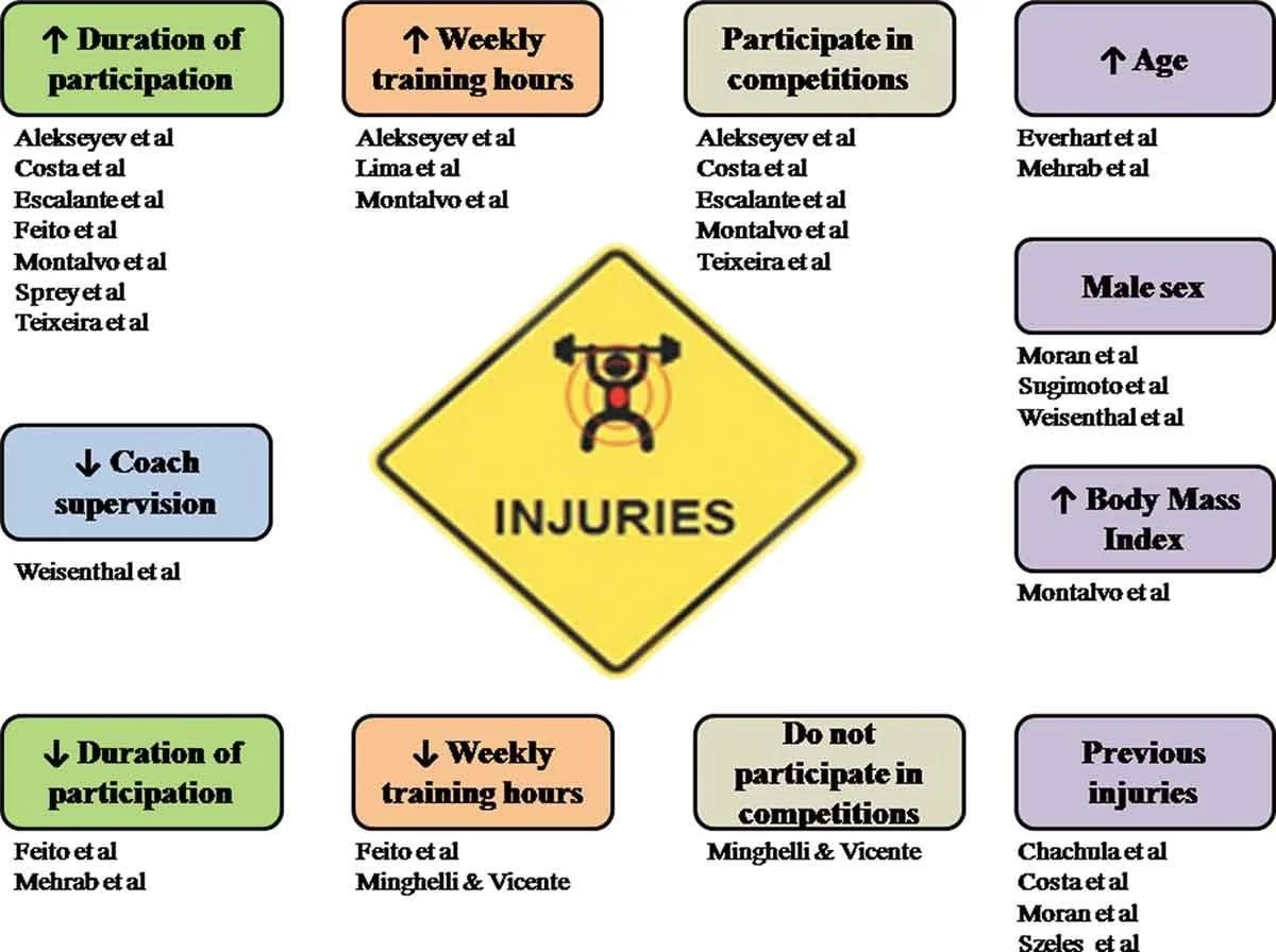 Otros factores como edad, estirar antes de la práctica, alternar diferentes cargas, y no visitar al fisioterapeuta de forma regular también se han mencionado como elementos de riesgo (5).
