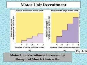 El número de unidades motoras que se contraen de forma simultánea determinar el grado de fuerza contráctil: el número de fibras por unidad motora dependen en gran medida de la función muscular; también influirá de forma significativa el tamaño de cada unidad motora (nº de fibras por unidad) lo que determina el orden en el que son reclutadas las fibras musculares