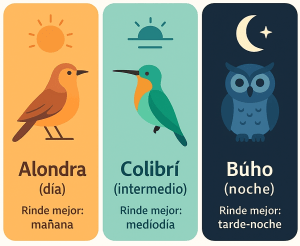 Alondras (matutinos): despiertan con energía, quieren entrenar temprano, el pico cognitivo es AM.