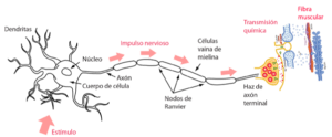 Representación esquemática del proceso desde la llegada de una señal nerviosa al haz terminal del axón nervioso hasta la contracción de una fibra muscular