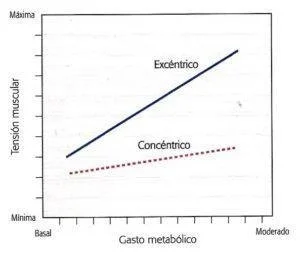 Gráfica fuerza-costo metabólico, comparando la contracción excéntrica con la concéntrica