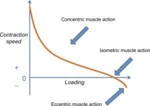 *En lo referente a la velocidad de contracción del músculo. Observamos que los valores más altos de velocidad se dan en contracciones concéntricas con bajas cargas, seguidas de las contracciones isométricas y encontramos a las contracciones excéntricas como la respuesta más “lenta” a pesar de que soporte mayores cargas.